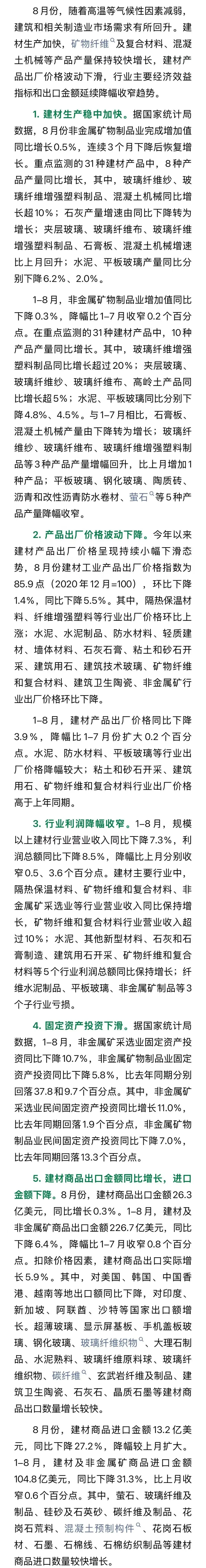 8月份建筑材料行業(yè)運(yùn)行情況簡報