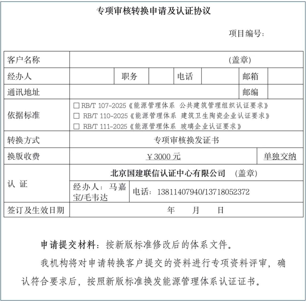 2025年10月17日國家認監(jiān)委發(fā)布公告(2025年第20號)中規(guī)定RB/T 110-2024《能源管理體系 建筑衛(wèi)生陶瓷企業(yè)認證要求》、RB/T 111-2024《能源管理體系 玻璃企業(yè)認證要求》及RB/T 107-2024《能源管理體系 公共建筑管理組織認證要求》標準于2025年12月1日實施。為做好認證標準轉(zhuǎn)換工作,我機構(gòu)就有關(guān)轉(zhuǎn)換事項通知如下。