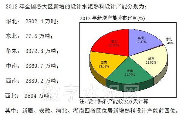 據中國水泥協會初步統計,2012年全國新投產新型干法水泥生產線124條,全年新增水泥熟料設計產能1.6億噸,其中:日產10000噸及以上生產線3條,占新增水泥熟料總產能的6.58%;日產4000~8000噸生產線75條,占新增水泥熟料總產能的70.47%;日產2000~4000噸生產線45條,占新增水泥熟料總產能的22.81%;日產1500噸生產線1條,僅占新增水泥熟料總產能的0.29%。