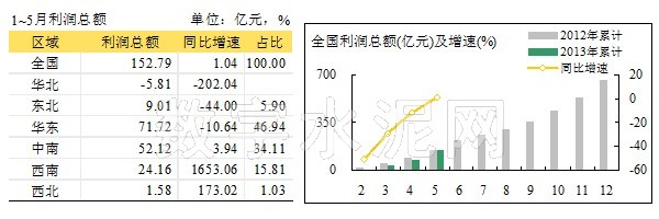 2013年前5個月全國水泥行業實現利潤總額152.8億元,略高于2012年,同比增長1%,從歷史同期上看,利潤總額是僅低于2011年,位居歷史第二位。