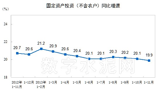 【固定資產投資】2013年1-11月份,全國固定資產投資(不含農戶)391283億元,同比名義增長19.9%,增速比1-10月份回落0.2個百分點。從環比看,11月份固定資產投資(不含農戶)增長1.47%。