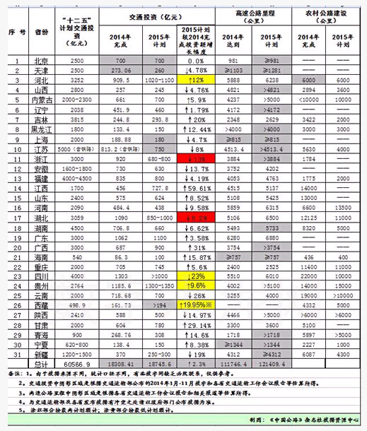 一張表讀出全國(guó)各地2015年交通建設(shè)投資情況