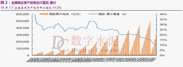 2015年1-7月我國(guó)城鎮(zhèn)固定資產(chǎn)投資28.8萬(wàn)億元,增速11.2%,增速較2014年同期下降5.8個(gè)百分點(diǎn),較1-6月下降0.2個(gè)百分點(diǎn);2015年7月我國(guó)城鎮(zhèn)固定資產(chǎn)投資5.1萬(wàn)億元,增速9.9%,增速較2014年同期下降5.8個(gè)百分點(diǎn);