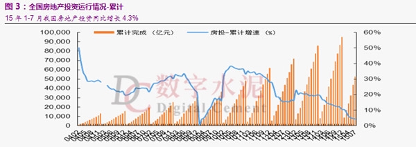 2015年1-7月國(guó)內(nèi)房地產(chǎn)投資累計(jì)完成5.3萬(wàn)億元,增速4.3%,增速較2014年同期下降9.4個(gè)百分點(diǎn);2015年7月國(guó)內(nèi)房地產(chǎn)投資完成0.86萬(wàn)億元,增速2.9%,增速較2014年同期下降9個(gè)百分點(diǎn);