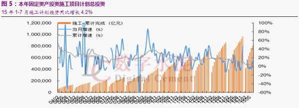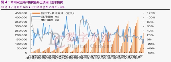 2015年1-7月新開(kāi)工項(xiàng)目計(jì)劃總投資22.7萬(wàn)億元,增速2.4%,增速較2014年同期下降12.2個(gè)百分點(diǎn),單7月新開(kāi)工項(xiàng)目計(jì)劃總投資同比增速4.8%;施工項(xiàng)目計(jì)劃總投資80.7萬(wàn)億元,增速4.2%,增速水平較2014年同期下降8.9個(gè)百分點(diǎn),單7月施工項(xiàng)目計(jì)劃總投資同比增速14.8%;