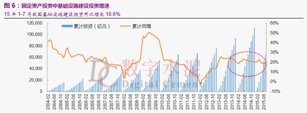 2015年1-7月我國(guó)基礎(chǔ)設(shè)施建設(shè)投資6.5萬(wàn)億元,增速18.6%; 2012年下半年至今一直作為“穩(wěn)增長(zhǎng)”引擎。