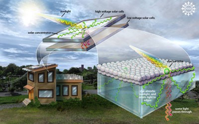 “這項(xiàng)新興技術(shù)是將一部分透射光分散在玻璃窗上,被納米粒子(半導(dǎo)體量子點(diǎn))吸收,然后重新發(fā)射出肉眼看不見的紅外波長(zhǎng),再被傳導(dǎo)到窗戶邊框上的太陽能電池上。”洛斯阿拉莫斯國家實(shí)驗(yàn)室首席研究員維克多·克里莫夫說。