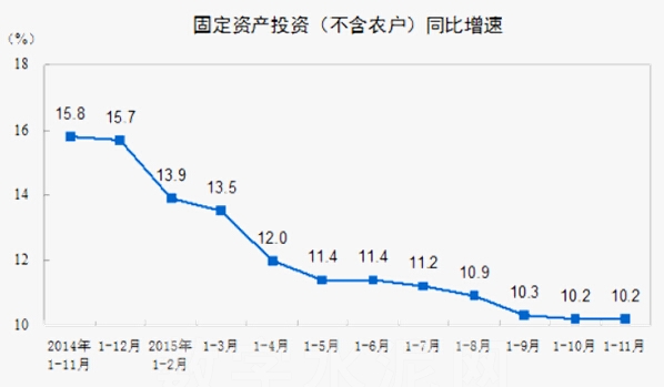 2015年1-11月份,全國固定資產投資(不含農戶)497,182億元,同比名義增長10.2%,增速與1-10月份持平。從環比速度看,11月份固定資產投資(不含農戶)增長0.73%。
