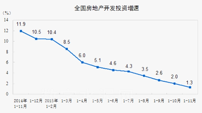 2015年1-11月份,全國房地產開發投資87,702億元,同比名義增長1.3%,增速比1-10月份回落0.7個百分點。其中,住宅投資59,069億元,增長0.7%,增速回落0.6個百分點。住宅投資占房地產開發投資的比重為67.4%。