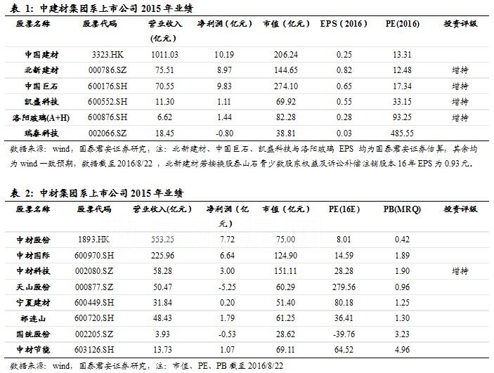 中建材集團系上市公司資產注入想象空間更大:對比兩大建材系央企,旗下的上市公司平臺數目相當,從資產證券化率上看,中材集團相對較為充分,大部分資產已經上市,而中國建材集團仍有大量可注入上市公司資產結合兩大央企集團各產業的布局和中長期發展規劃,我們認為,“中建材系”北新建材、中國巨石有望率先“破局”,而“中材系”中材科技、天山股份、祁連山、 寧夏建材等有望以點帶面推進改革,我們看好兩大央企集團內上市公司的市值提升空間。繼續推薦“中建材系”:北新建材、中國巨石;“中材系”改革受益標的:具備整合承諾到期的水泥板塊三家:天山股份、寧夏建材、祁連山、玻璃纖維等復合材料整合平臺型公司中材科技、以及受益于地下管廊建設的國統股份、受益于“一帶一路”的中材國際、中材節能。