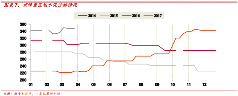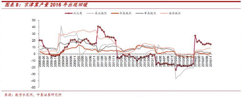 ![]() 從產量角度看,京津冀地區(qū)水泥產量(以河北為主)在2016年出現(xiàn)了明顯回暖趨勢。我們認為隨著京津冀一體化的不斷推進,區(qū)域內水泥總體需求仍能維持穩(wěn)定增長。