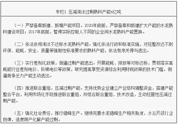 1、加快淘汰落后產(chǎn)能優(yōu)化結(jié)構(gòu),推進企業(yè)聯(lián)合重組,化解產(chǎn)能過剩,實現(xiàn)壓減淘汰過剩熟料產(chǎn)能4億噸。