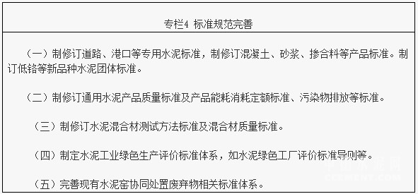 修訂并提升水泥行業(yè)產(chǎn)品能源消耗定額、污染物排放、產(chǎn)品質(zhì)量等強制性標準,引導(dǎo)產(chǎn)業(yè)整體提升加快轉(zhuǎn)型升級。加快新產(chǎn)品、新技術(shù)、新工藝和新裝備的技術(shù)標準提升制定,推進標準體系建設(shè),研究制定測試方法標準、應(yīng)用規(guī)范標準、水泥行業(yè)綠色生產(chǎn)評價標準等制訂。開展“一帶一路”沿線國家和地區(qū)的水泥產(chǎn)品標準對比研究與制訂,支持參與國際標準制(修)訂工作。依據(jù)市場需要,更多的制訂協(xié)會團體標準。