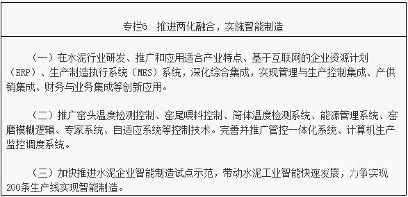 貫徹落實《中國制造2015》,通過政策引導(dǎo)和鼓勵,進一步加快推動水泥行業(yè)兩化融合工作,提升水平全面推廣,實現(xiàn)智能制造、控制、管理。