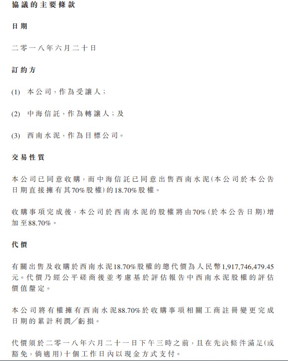 ??中國建材(03323)公布,于2018年6月20日,該公司與中海信托及西南水泥訂立協(xié)議,該公司擬向中海信托收購西南水泥18.70%股權(quán),總代價為19.18億元人民幣。