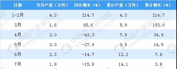 據中商產業研究院數據庫顯示,2018年3-6月江蘇省衛生陶瓷產量逐漸增長,2018年6月江蘇省衛生陶瓷產量為2.3萬件,同比下降14.7%。2018年7月江蘇省衛生陶瓷產量下降,2018年7月江蘇省衛生陶瓷產量為1.9萬件,同比下降15.8%。2018年1-7月江蘇省衛生陶瓷產量為14.1萬件,同比增長3.8%。