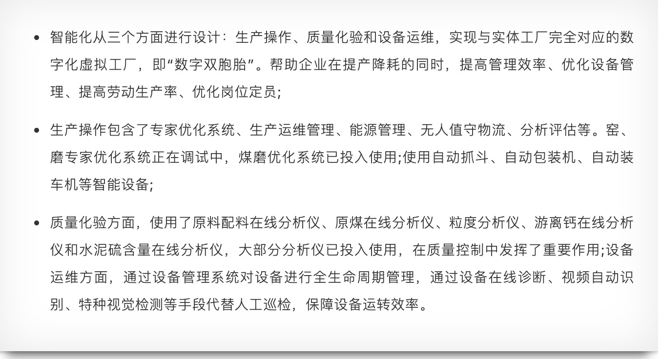 在智能化裝備領域我們不僅借鑒發達國家的先進經驗,取其精華,去其糟粕。同時國內諸如中材國際,安徽凱盛院等設備生產研發企業在水泥生產線智能化研發生產方面均具有了與世界巨頭比肩的優勢。