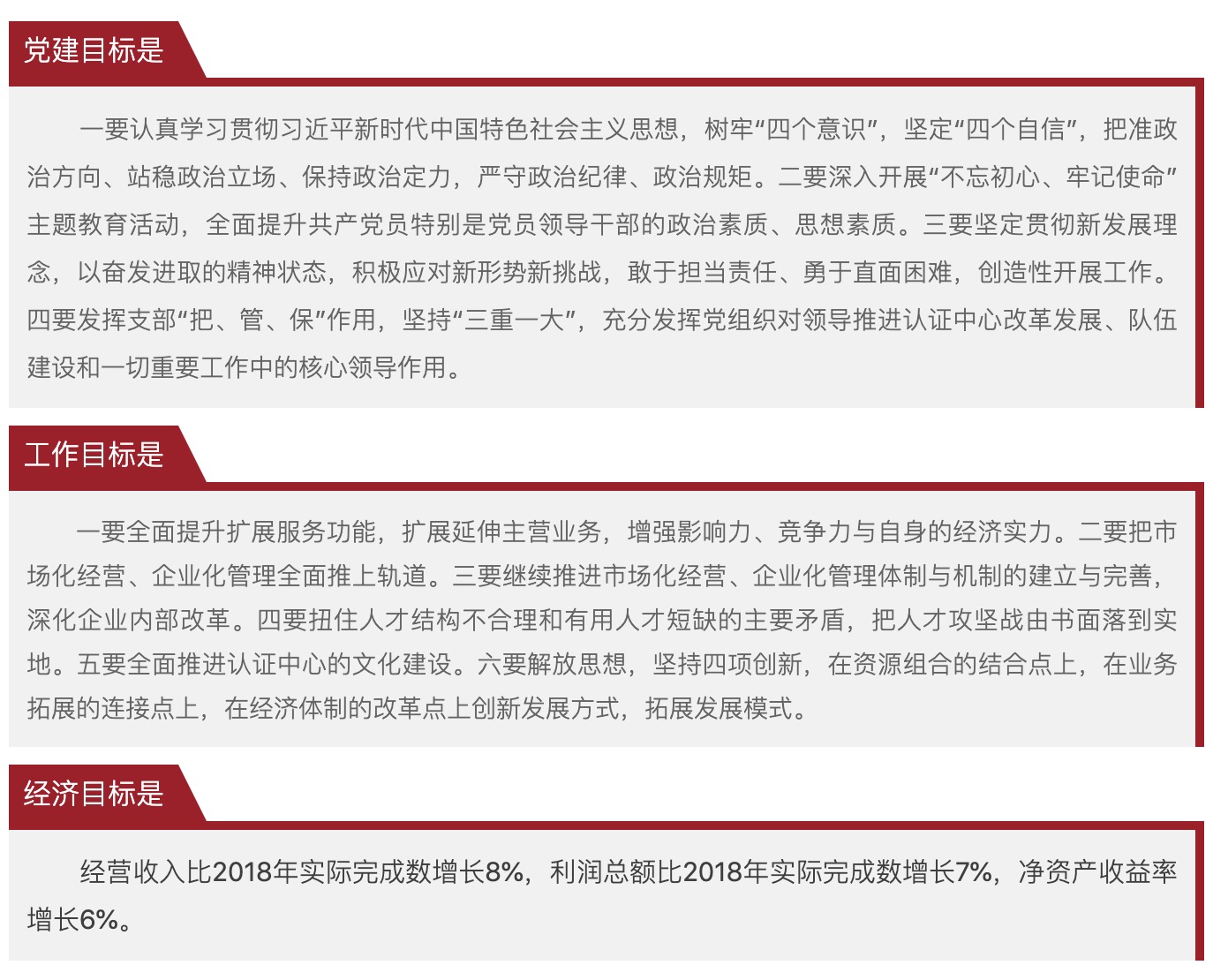 2019年是認證中心實現(xiàn)三年目標的關鍵之年,認證中心將在中國建筑材料聯(lián)合會的領導下,堅定“四個自信”,牢固樹立“四個意識”,踐行“兩個維護”,全面貫徹落實黨的十九大精神,認真學習和落實新時代的內(nèi)涵,將政治站位,思想定位,目標定位與黨中央保持高度一致,以黨的政治建設為統(tǒng)領,切實加強黨的建設、業(yè)務建設、制度建設、人才建設和文化建設工作。堅持執(zhí)行建材聯(lián)合會“引領、協(xié)調(diào)、服務”的發(fā)展宗旨和定位,按照“中建材聯(lián)綜發(fā)〔2019〕25號”文件精神要求,緊緊圍繞聯(lián)合會系統(tǒng)2019年制訂目標的“12項重點工作”,包括直屬單位的六項重點任務,按照中心三年發(fā)展目標及“345工程”建設思想,創(chuàng)新思維方式、創(chuàng)新領導方法和工作方法、創(chuàng)新發(fā)展模式和體制機制,立足認證中心的主營工作,拓展業(yè)務橫向功能,延伸業(yè)務縱向產(chǎn)業(yè)鏈,推進企業(yè)化管理。認證中心全體職工將堅定信心、勇于擔當,繼續(xù)推進認證中心改革和發(fā)展,堅持服務為本、質(zhì)量第一、效益優(yōu)先。