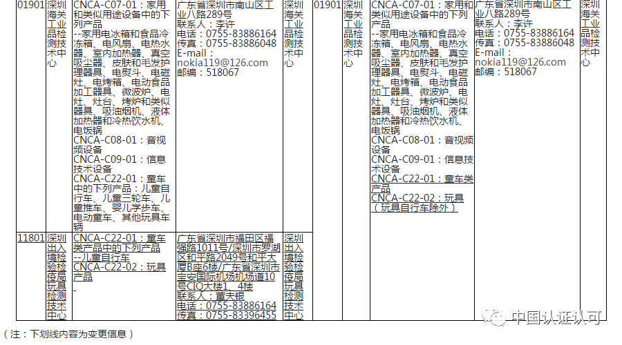 部分CCC認證指定機構信息變更