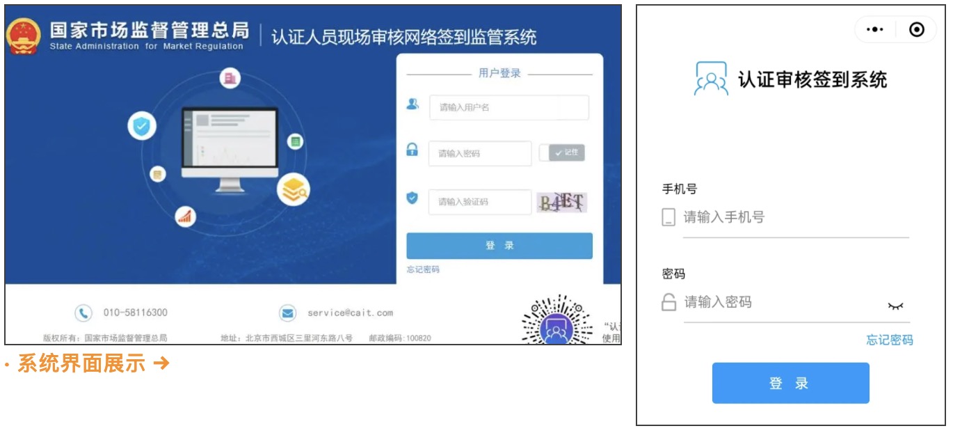 為維護公平競爭的認證市場秩序,加強對認證機構和審核人員的規范管理,認監委決定依托互聯網、大數據技術優勢,上線認證人員現場審核網絡簽到監管系統(以下簡稱認證審核簽到系統)。為保障認證審核簽到系統順利上線運行,現將有關事項通知如下:
