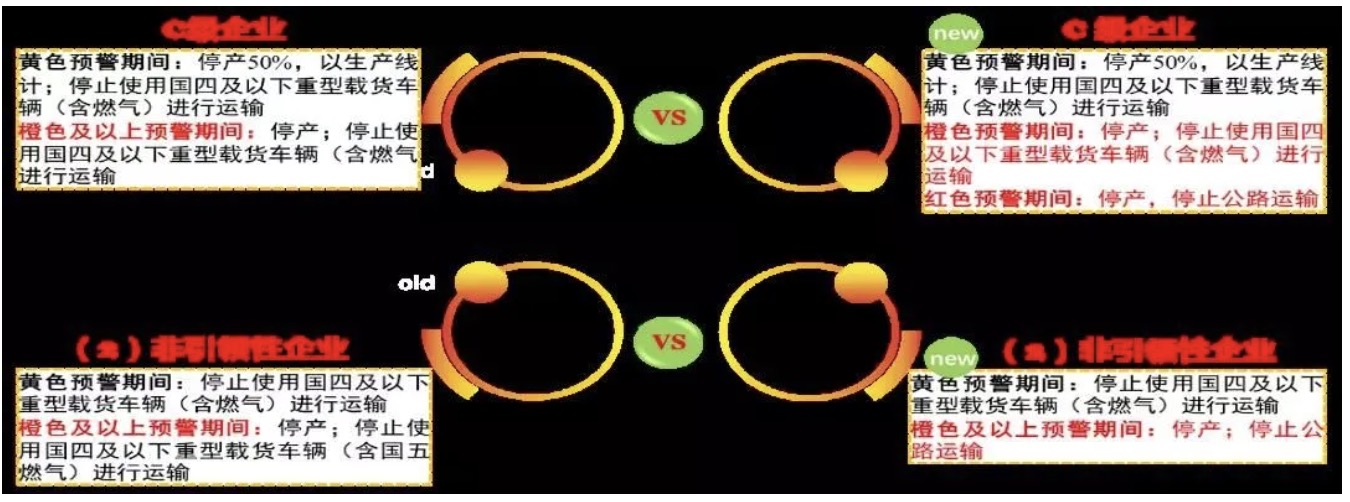 變動原因:開展績效分級工作是為了通過差異化的指標,鼓勵先進,鞭策后進。水泥行業B級企業在橙色預警期間,采取的減排措施是限產20%,C級企業是停產,體現出了不同級別企業采取措施的差異性。但在紅色預警期間,B級和C級企業都是停產,停止國四以下車輛運輸,沒有體現出不同級別采取措施的差異性,無法達到鼓勵B級,鞭策C級的目的,因此,將C級的措施更改為停產,停止公路運輸,體現B級和C級之間的差異。