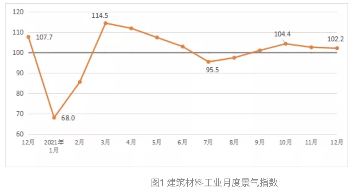 一、2021年12月建筑材料工業(yè)景氣指數(shù)2021年12月份建筑材料工業(yè)景氣指數(shù)為102.2點,低于上月0.5個點,高于臨界點,處于景氣區(qū)間。12月份建材市場需求呈現(xiàn)低位增長,建材生產(chǎn)延續(xù)平穩(wěn)態(tài)勢,原燃材料價格較前期回落,建材產(chǎn)品價格高位回調(diào)。