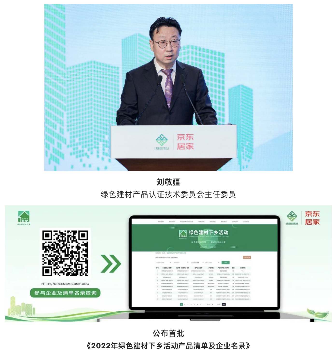 工業和信息化部原材料工業司副司長邢濤,農業農村部農村社會事業促進司副司長、一級巡視員何斌,國家鄉村振興局開發指導司副司長、二級巡視員劉曉山,商務部消費促進司處長王勇,國家市場監督管理總局認證監管司處長丁兆國;中國建筑材料聯合會會長閻曉峰、常務副會長陳國慶,綠色建材產品認證技術委員會主任委員劉敬疆,中國建筑材料流通協會會長秦占學,中國木材保護工業協會會長劉能文,中國建材工業經濟研究會會長曾令榮,中國扶貧開發協會王衛東主任等領導,京東集團副總裁、京東零售公共事務負責人馮全普,京東零售集團居家事業部總經理何超,以及認證單位和企業代表及媒體線上線下共同參加。
