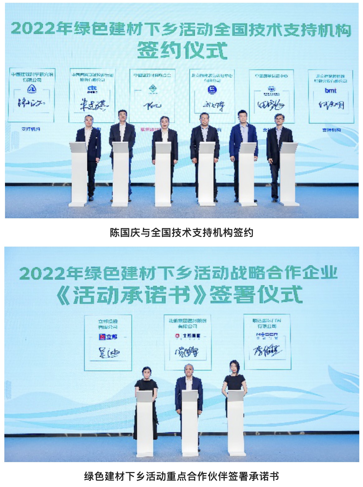 綠色建材下鄉工作推進領導小組組長陳國慶代表活動推進組與北京國建聯信認證中心、中國國檢測試控股集團、中國建筑科學研究院認證中心、中國質量認證中心、北京建筑材料檢驗研究院等5家國內主流認證機構簽署“2022年綠色建材下鄉活動全國技術支持機構合作協議”,將委托上述機構配合活動推進組承擔為企業提供產品技術及認證工作等方面咨詢及服務工作,為綠色建材下鄉活動提供全國技術支持工作。