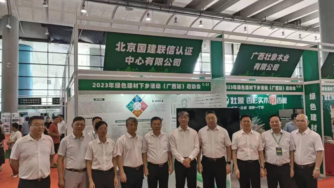 儀式結束后,與會領導參觀了廣西綠色建材產品展銷會。本次展銷會共有來自區內外的80余家企業參展,涉及水泥、玻璃、陶瓷、石材、涂料、家居板材、防水卷材等大類及光伏玻璃產業鏈、固廢綜合利用等領域。與會的各級領導來到國建聯信認證中心展位前,參觀指導工作,并合影留念。