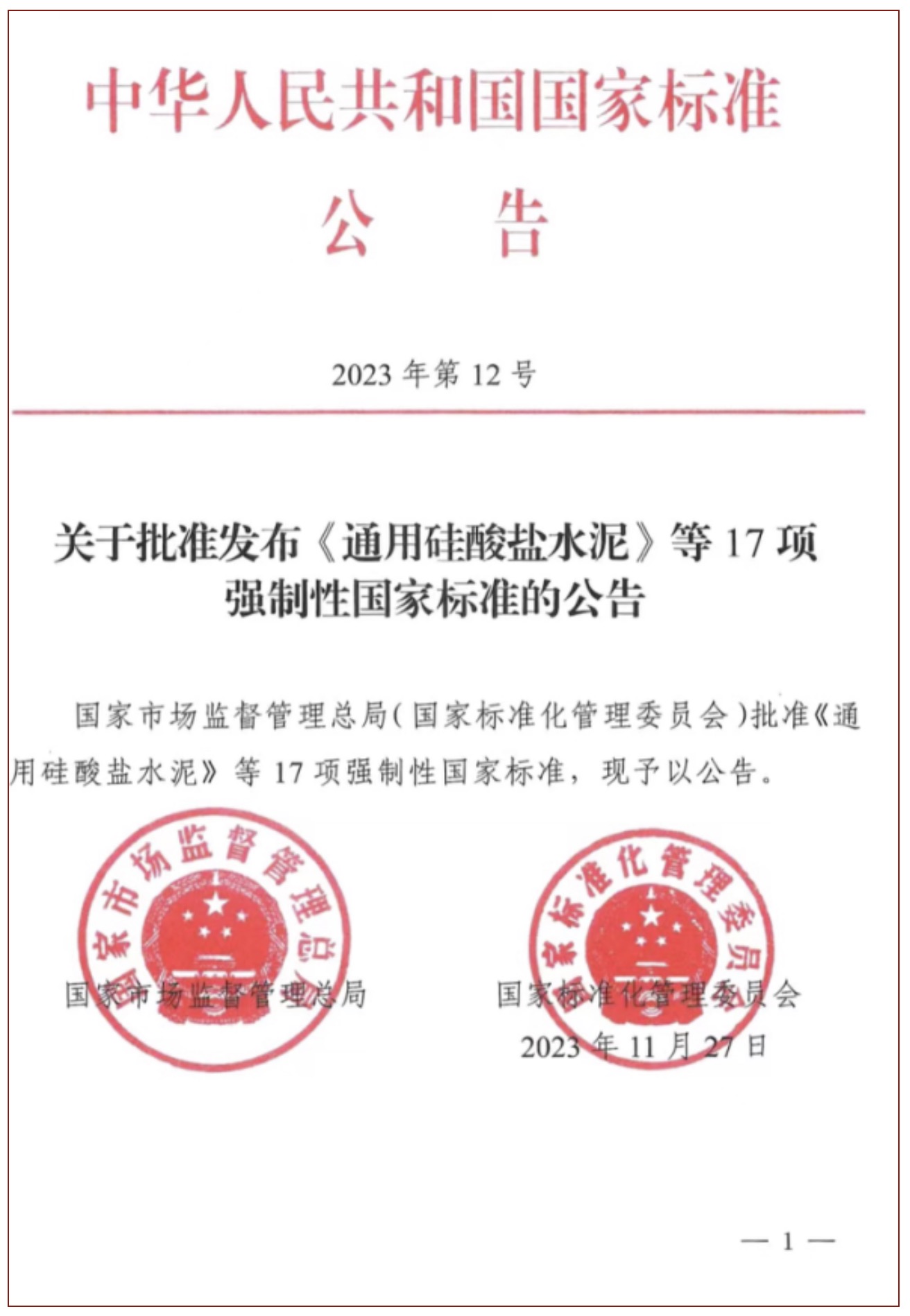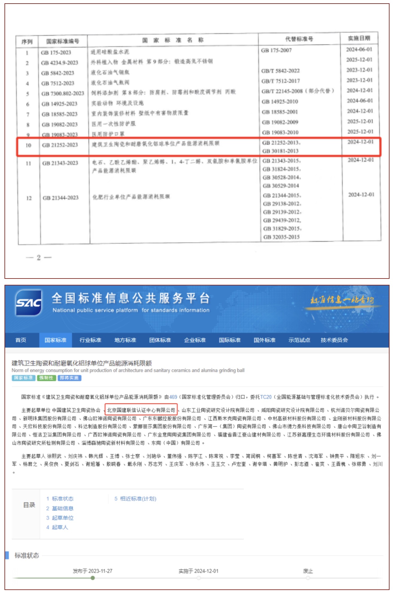2023年11月27日國家市場監督管理總局(國家標準化管理委員會)批準并發布《通用硅酸鹽水泥》等17項強制性國家標準,標準清單中《建筑衛生陶瓷和耐磨氧化鋁球單位產品能源消耗限》(GB 21252—2023)正式發布,實施日期為2024年12月01日,過渡期一年。
