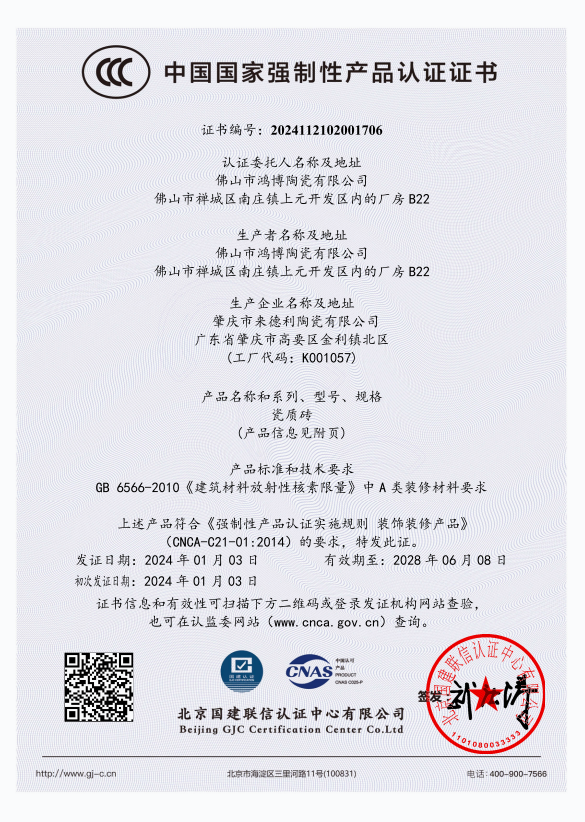 2024年1月3日,北京國建聯信認證中心有限公司(簡稱“國建認證“)為佛山市鴻博陶瓷有限公司頒發了瓷質磚CCC認證證書,這是國建認證施行CCC電子證書后頒發的首張認證證書。