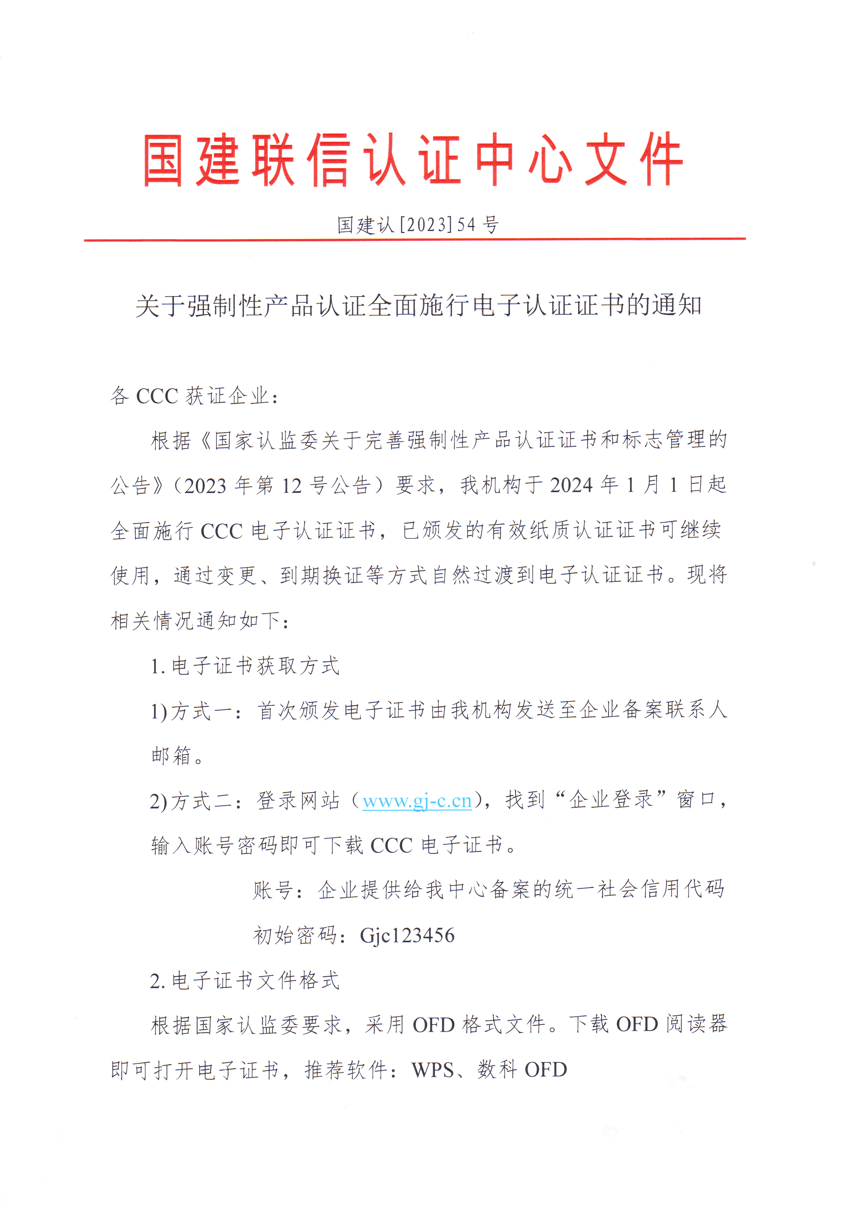 根據《國家認監委關于完善強制性產品認證證書和標志管理的公告》(2023年第12號)要求,為確保公告中各項舉措的順利實施,國建認證積極研討制定并落實關于強制性產品認證電子證書的工作方案,已順利完成CCC認證電子證書系統部署、制作及防偽等各項工作,自2024年1月1日起CCC認證全面施行電子認證證書。
